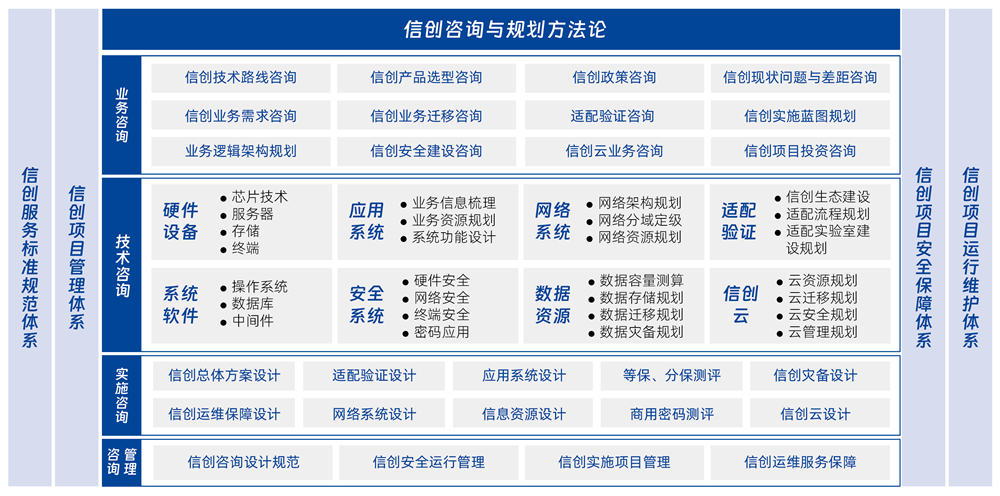 BB贝博艾弗森官网依托十多年为党政、金融、教育等行业客户信创服务经验,运用系统工程咨询方法论,从顶层设计开始,为客户提供全方位的信创咨询与规划服务。通过顶层设计为各行业用户提供信创业务规划设计、信创应用迁移适配,信创项目集成实施,信创云、信创安全建设、信创智能运维保障等方向的一站式信创咨询服务及解决方案。