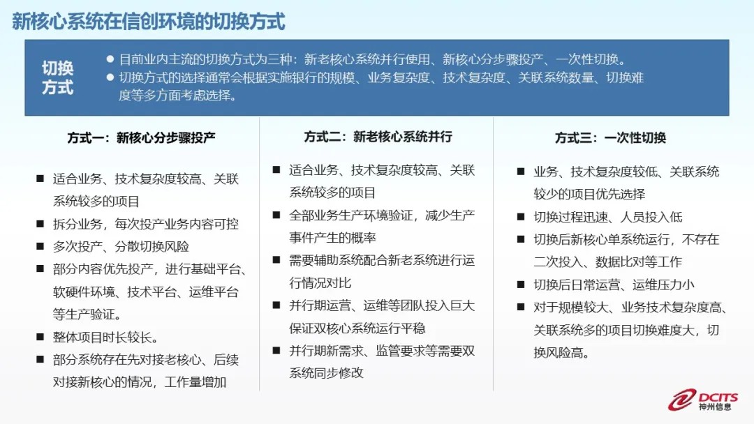 一是信创环境下,核心系统的切换方式。根据实施银行的规模、业务和技术复杂度及关联系统数量等方面,一般采用“并行使用、分批次投产和一次性切换”三种方式。